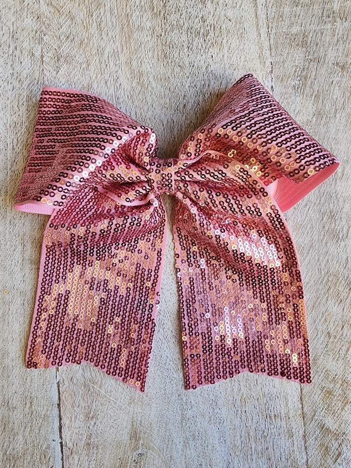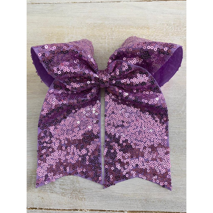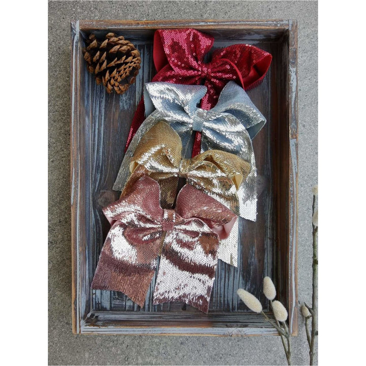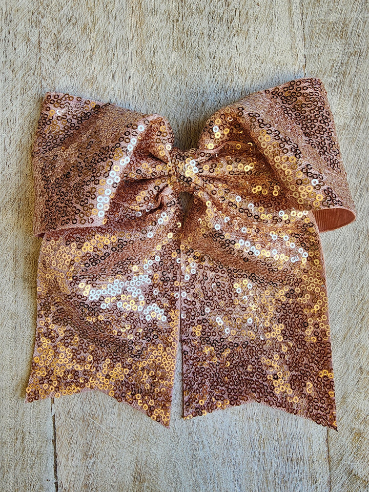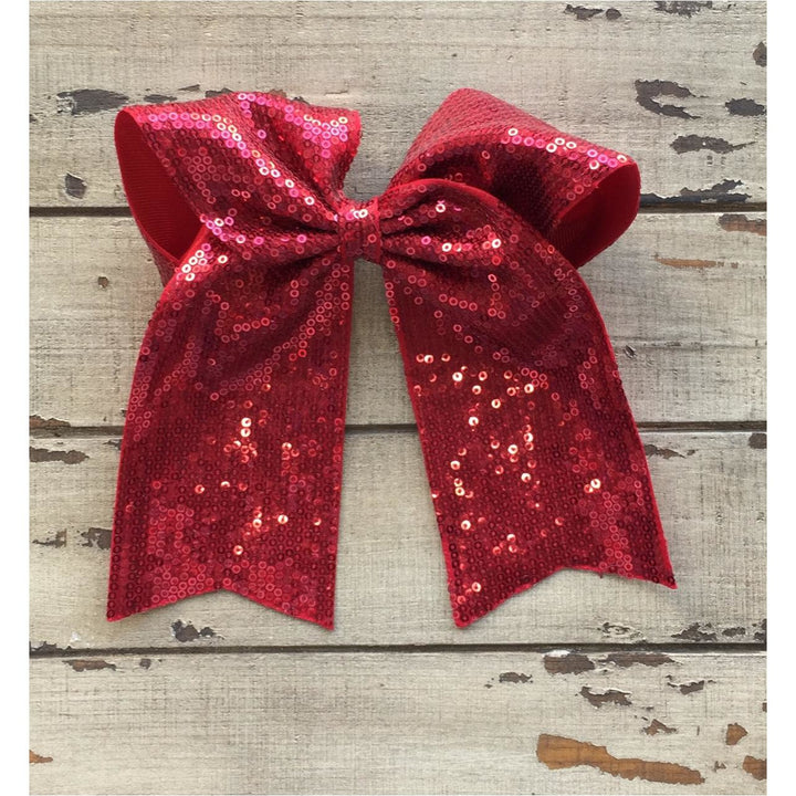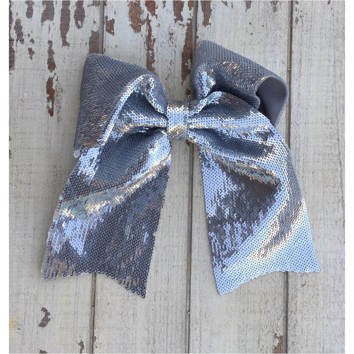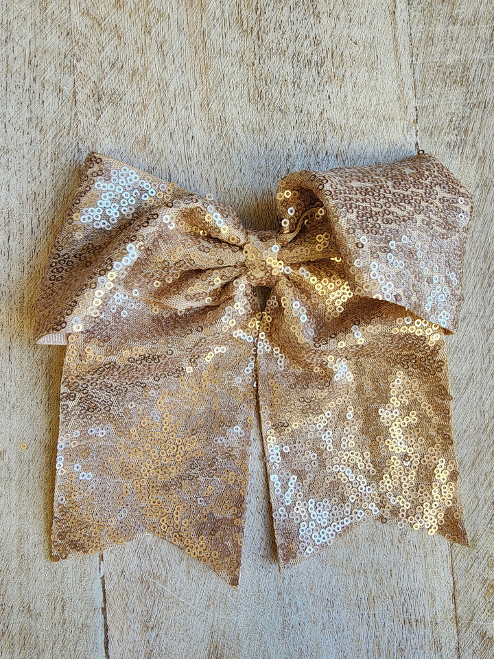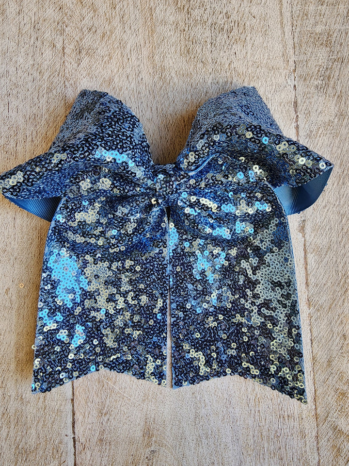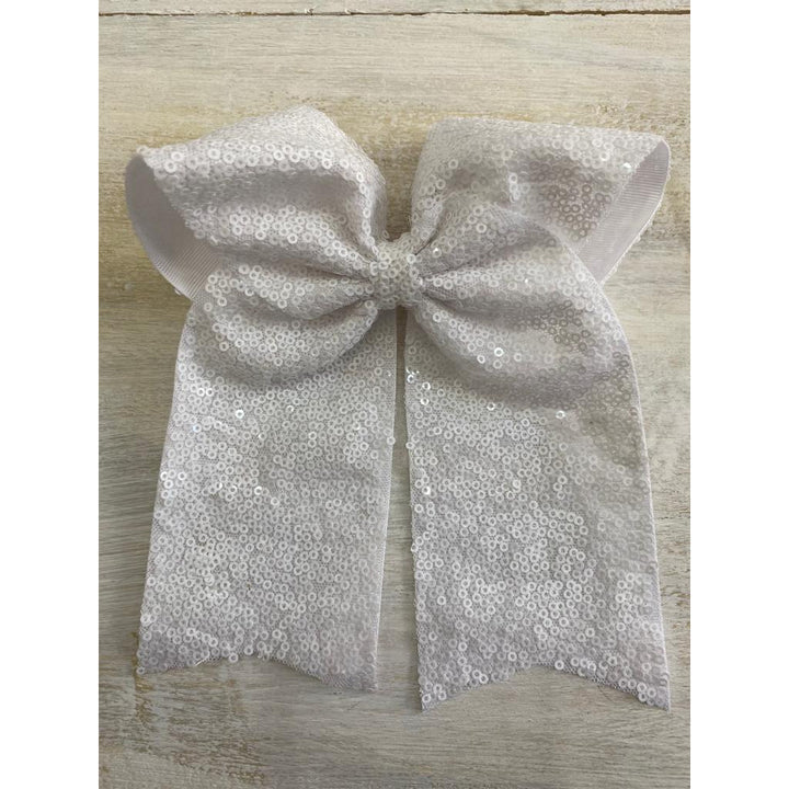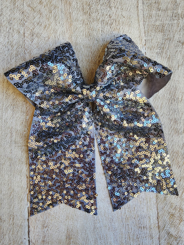 Lazada elaborada a mano con listón de lentejuela de 3 pulgadas de ancho. Terminacion en " V" en los extremos. Montada en clip metálico dentado.