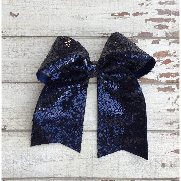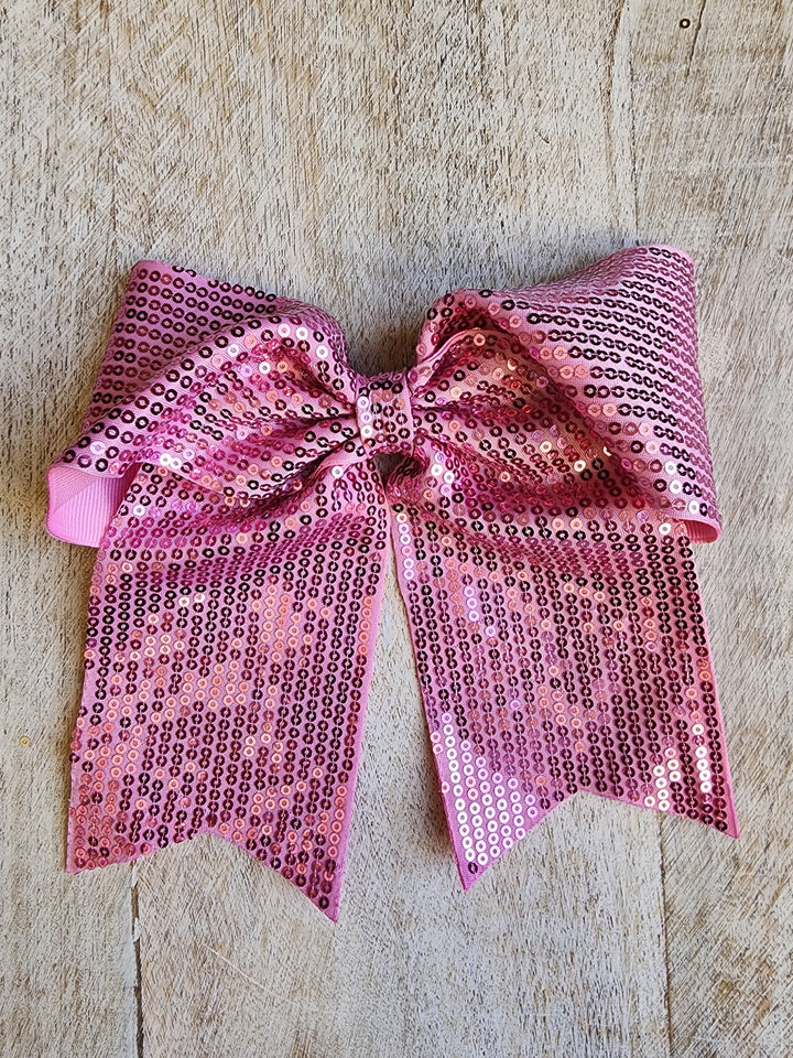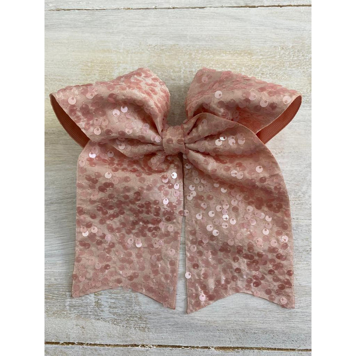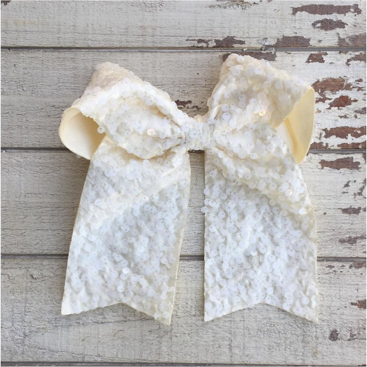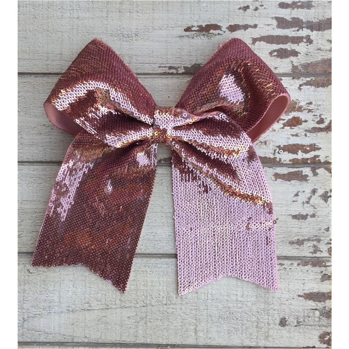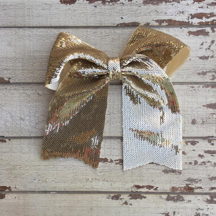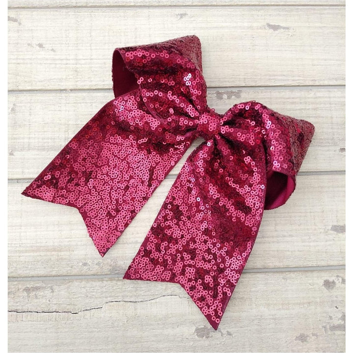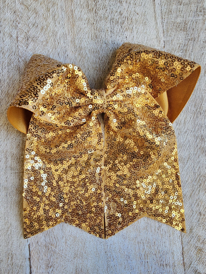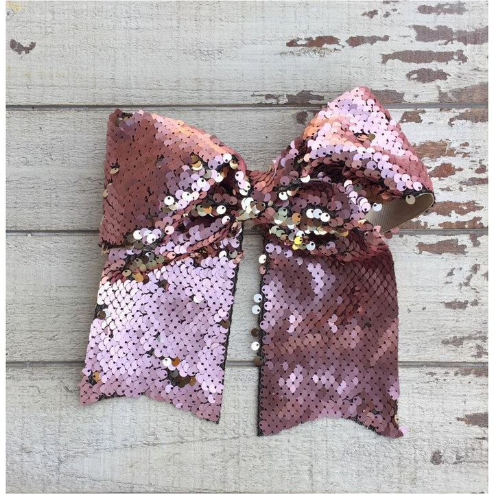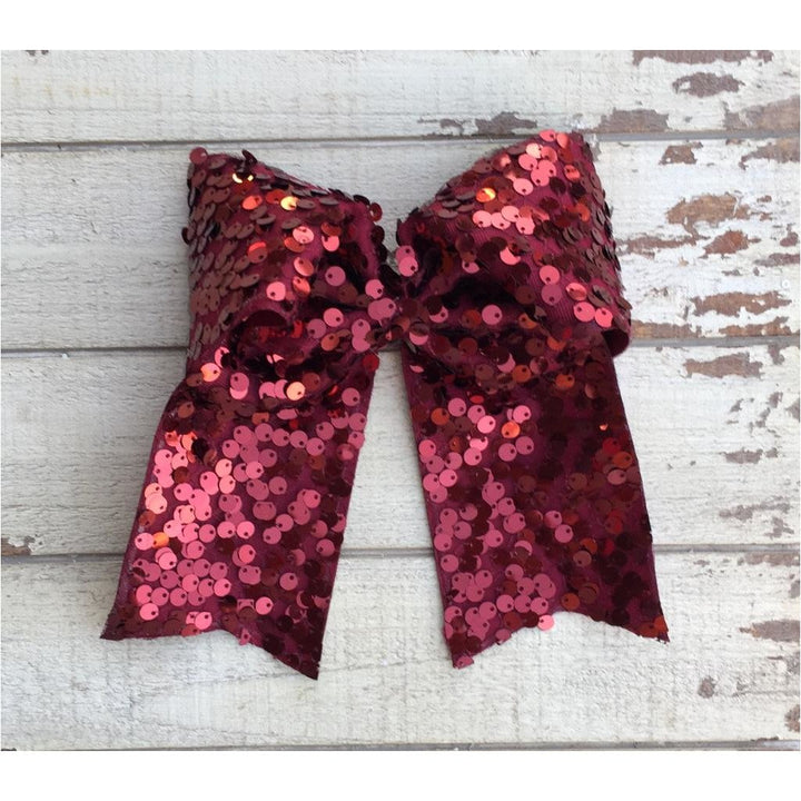 Lazada elaborada a mano con listón de lentejuela de 3 pulgadas de ancho. Terminacion en " V" en los extremos. Montada en clip metálico dentado.
