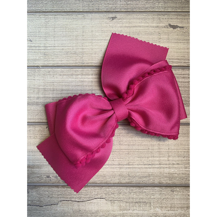 Lazada elaborada a mano con listón de falla importada de 3 pulgadas de ancho, mono superior con base de falla con pompon mini del mismo tono en la orilla. Terminación en "Zig Zag" en los extremos. Montada en clip metálico dentado.
