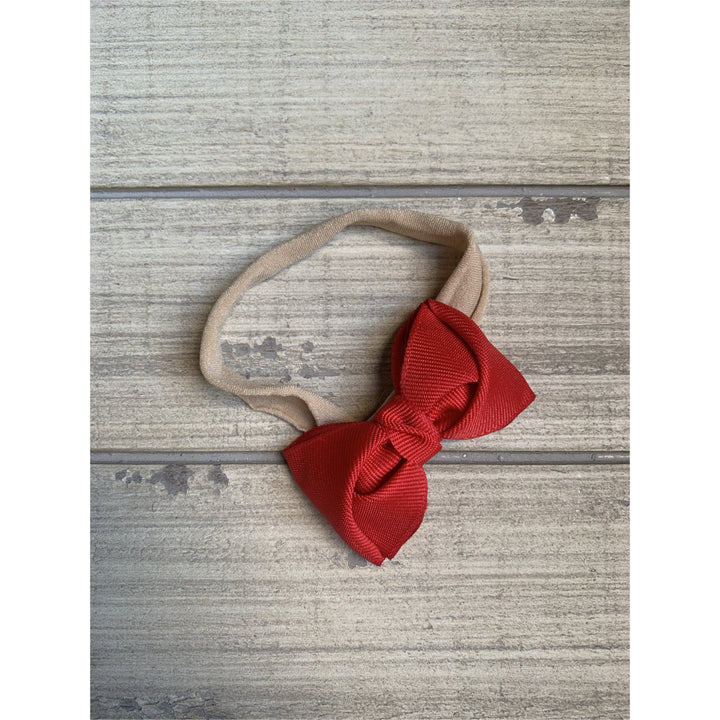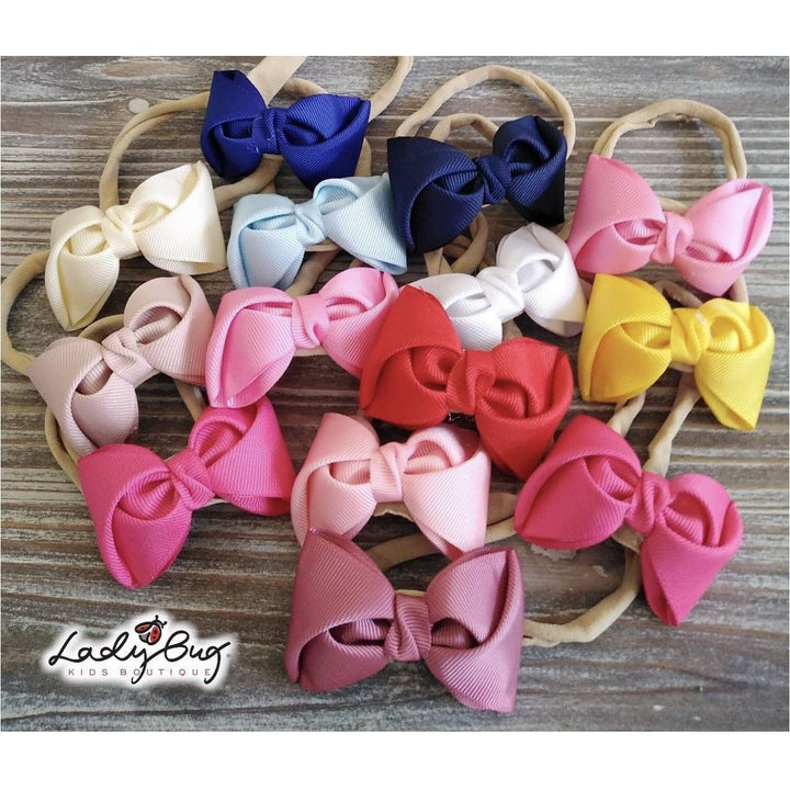 Lazadas elaborada a mano con listón de falla importada de 7 cm de ancho. Montada en banda mini de nylon color natural .El moño montado mide 7 cm.