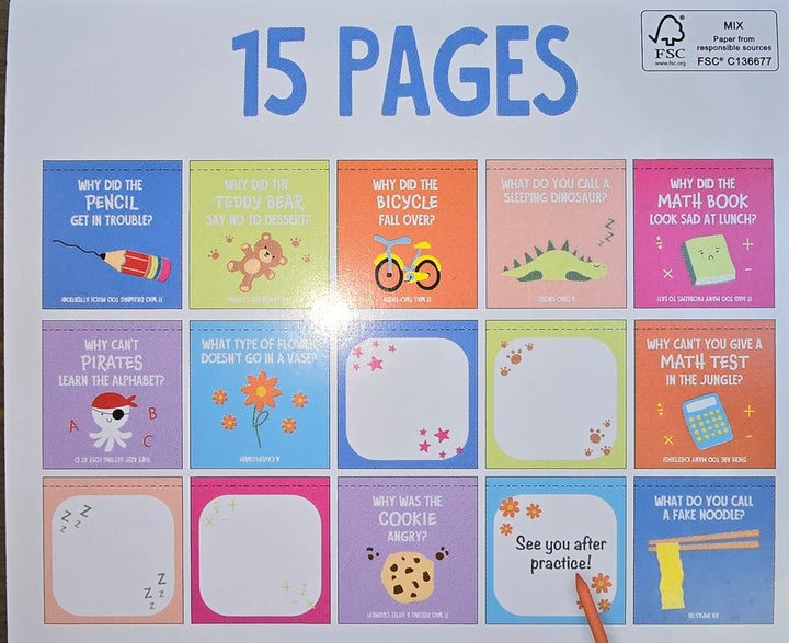 15 hojas de notas con adivinanzas infantiles para incluirlas en los almuerzos y hacer un momento divertido a tu pequeño al descubrir la sorpresa.