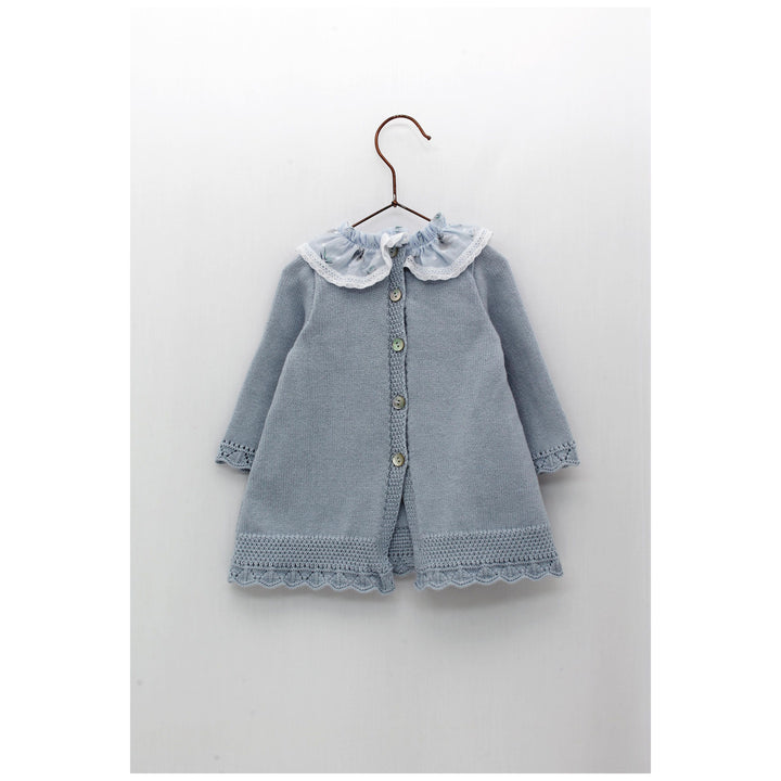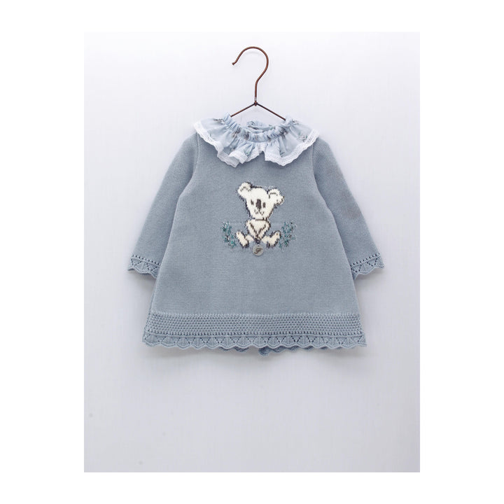 Vestido punto con cuello volante y dibujo koala en color celeste empolvado. Colección Bióloga