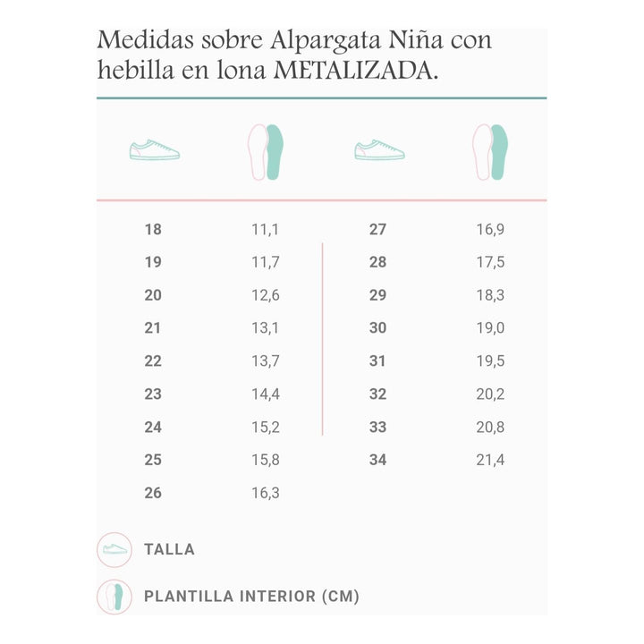 Alpargata de lona con hebilla y acabado metalizado para niñas. Con cierre de hebilla para una mayor comodidad y una perfecta sujeción. Lona natural 100% algodón piqué de primera calidad y acabado metalizado. Son un básico de esta primavera verano totalmente renovado y actualizado. Combinan con todos sus conjuntos. Los brillos y metalizados están muy de moda en todas las colecciones de ropa esta primavera-verano. Son perfectas para ocasiones especiales.