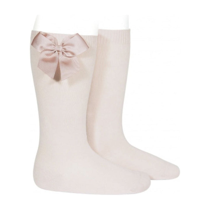 Calcetines de algodón, altos por debajo de la rodilla, en punto liso y con detaille de lazo de gros-grain a tono en el lateral.