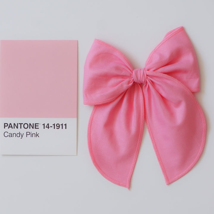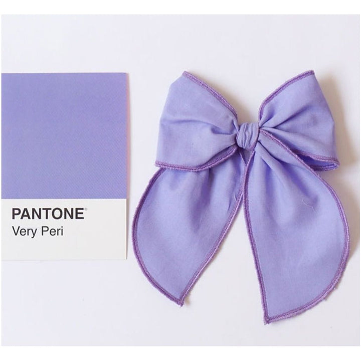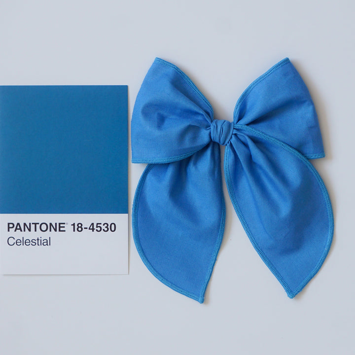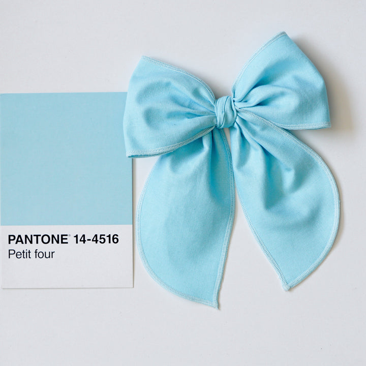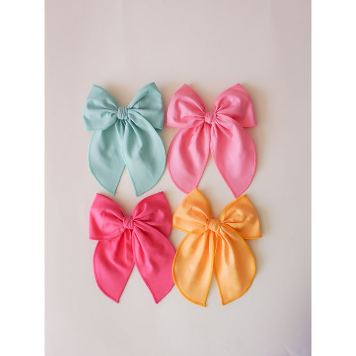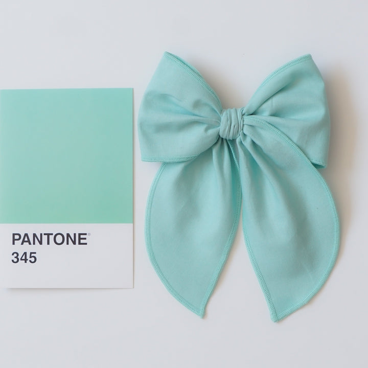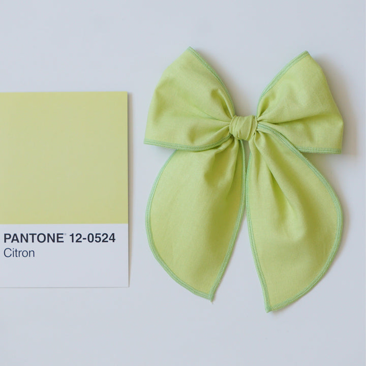 Moño elaborado a mano con tela de algodón, orilla en zigzag con hilo a tono.
