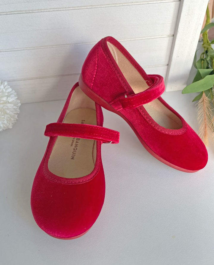 Mercedita con velcro para vestir en lona terciopelo en color rojo para niñas. Realizada en 100% algodón natural terciopelo para vestir con acabados de primera calidad y en color rojo. Lona Terciopelo con diseño y texturas muy elegantes para vestir en el día a día o para ocasiones especiales. Muy cómodas, prácticas y diferentes. Es un clásico de mercedita pero realizada en un diseño en terciopelo especial para épocas con temperaturas más frías. Con cierre con velcro, que permite una adaptabilidad total a cualquier tipo de empeine. Son perfectas para combinar con toda su ropa este otoño-invierno. En color rojo muy de moda esta temporada en todas las colecciones infantiles.