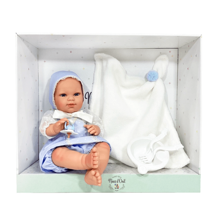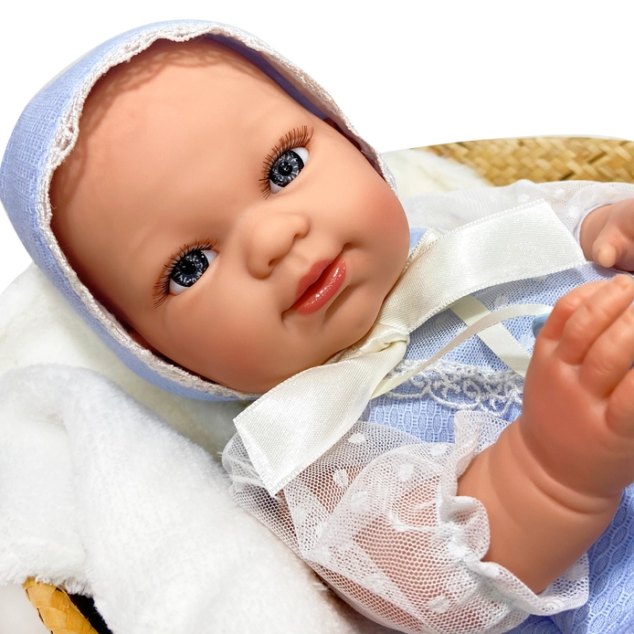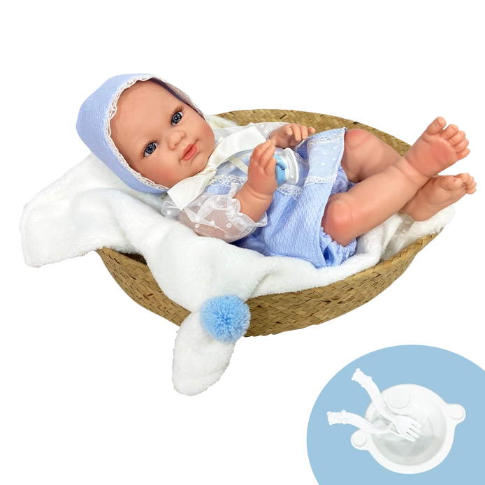 Presentamos los bebé más juguetones que tenemos, todo su cuerpo es de vinilo, lo podrás bañar, colocar en la posición que quieras, son preciosos. La ropita es preciosa, los detalles de plumeti, hacen de este muñeco una auténtica cucada. Su capota para la cabeza acabada en puntilla, es preciosa. Tienen un tamaño de 37cm Su cuerpo es de vinilo Va sexuado, este muñeco es un niño Lleva chupete Incorpora ser de vajilla, plato, cuchara y tenedor Mantita suave Va presentado en estuche No incorpora la cesta, es sólo un elemento decorativo.