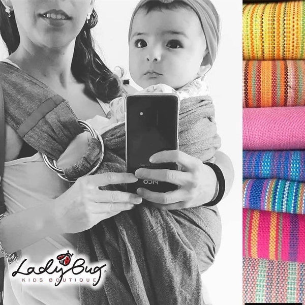 Rebozo maternal de telar elaborado por manos mexicanas con aro metálico.