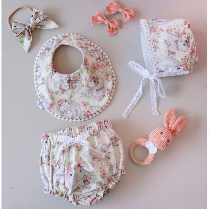 Set compuesto por Bloomer, babero, Capota y bandita a juego , 100% algodon , elaborado a mano.