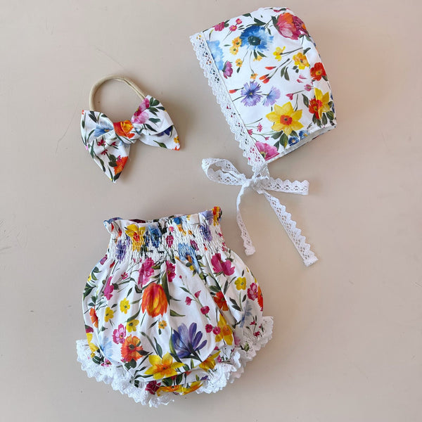 Set compuesto por Bloomer, Capota y bandita a juego , 100% algodon , elaborado a mano.