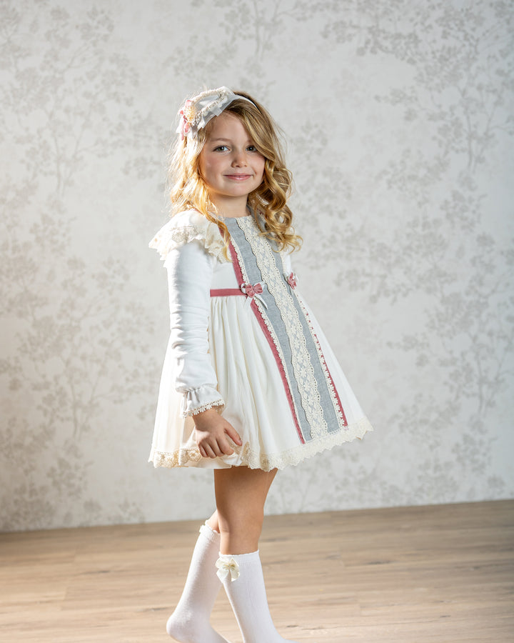 VESTIDO INFANTIL ESPAÑOL DE ALTA COSTURA. Diseño de corte clásico, inspirado en la tradición de la moda infantil española. Presenta una silueta con falda vuelo y un cuerpo entallado. Cada prenda es confeccionada a mano en talleres especializados en España, con un acabado perfecto con costuras invisibles y bordados personalizados, lo que garantiza una pieza única y exclusiva.