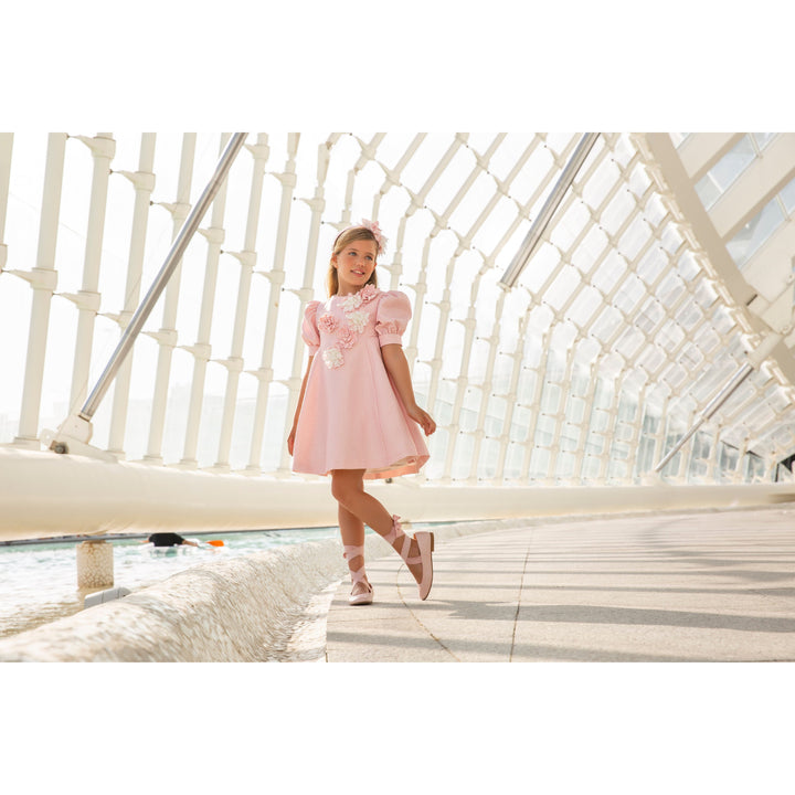 Hermoso vestido de gala elaborado con las mas finas telas españolas, forrado y crinolina incluida para dar volumen a la parte baja del vestido.