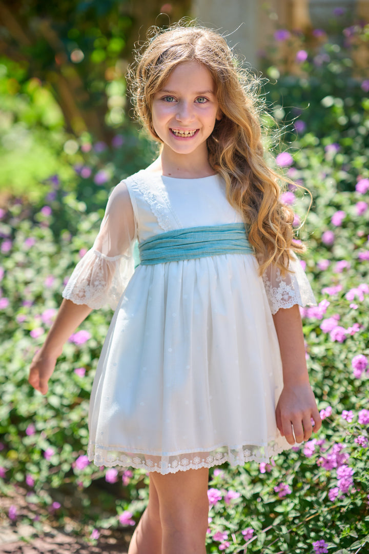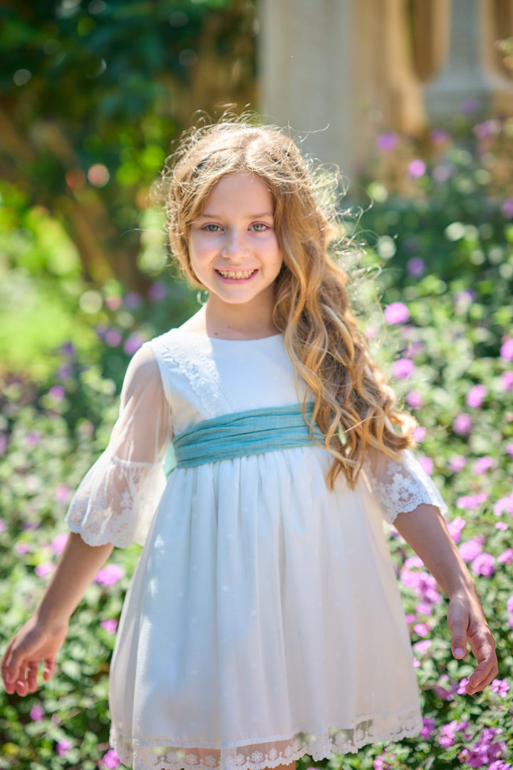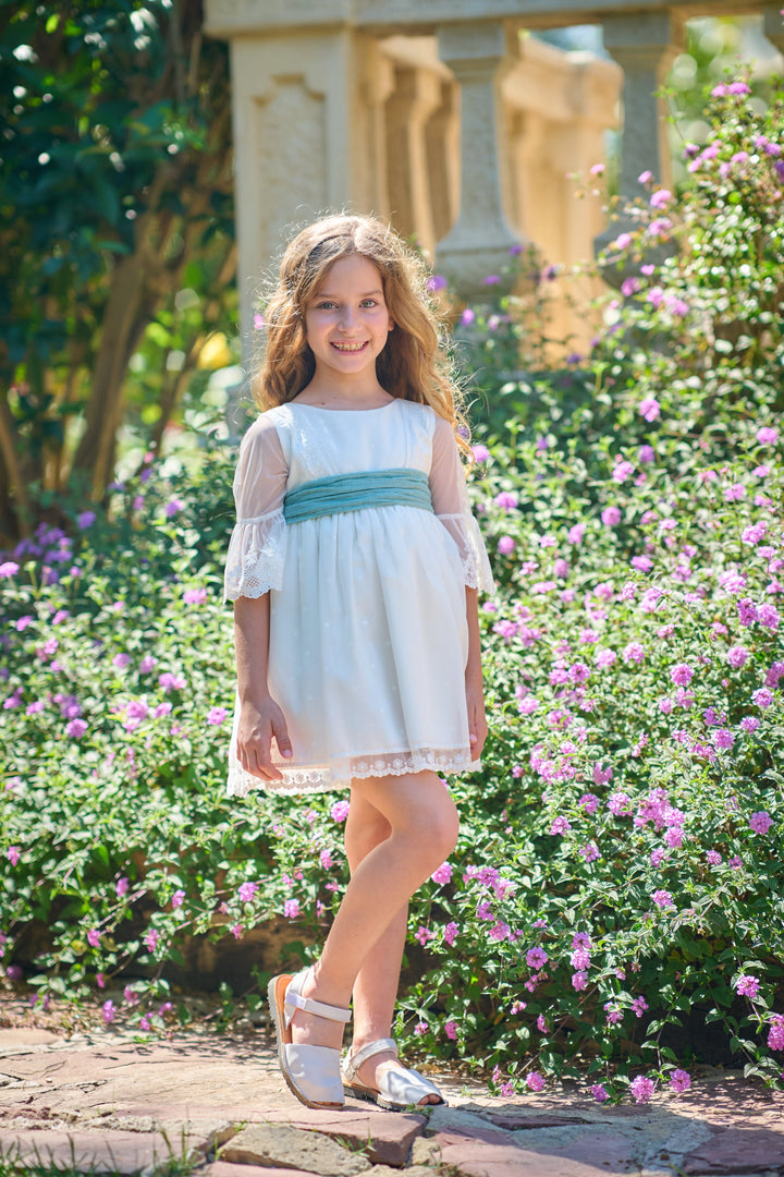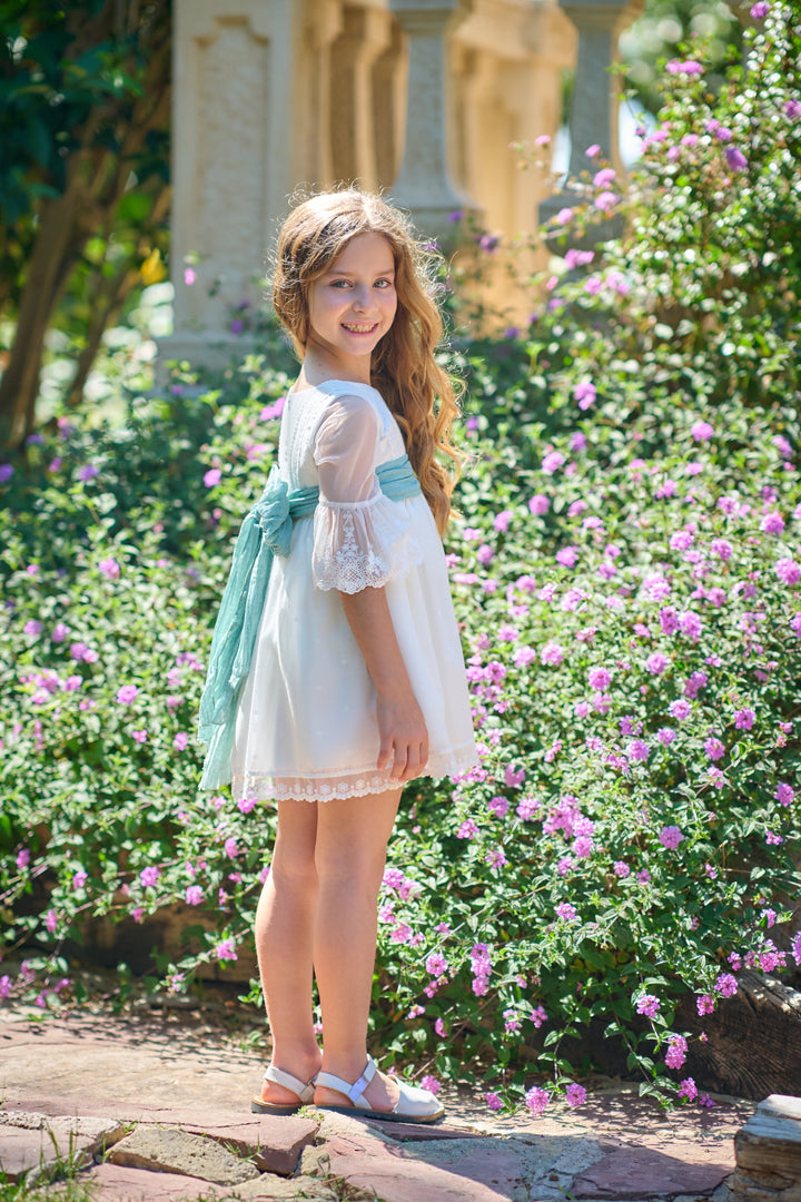 Vestido Etamin Lunar Blanco con Lazo Menta