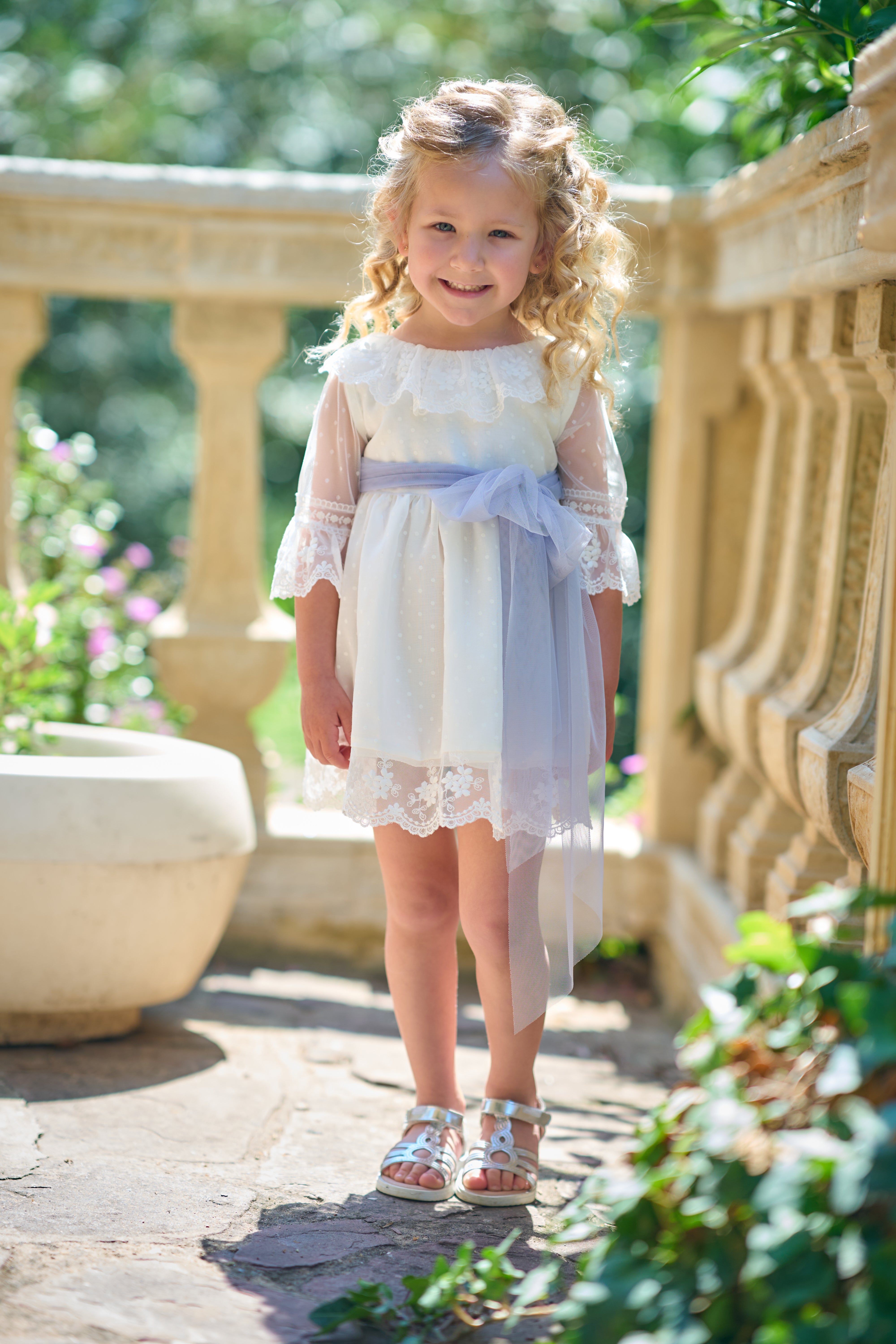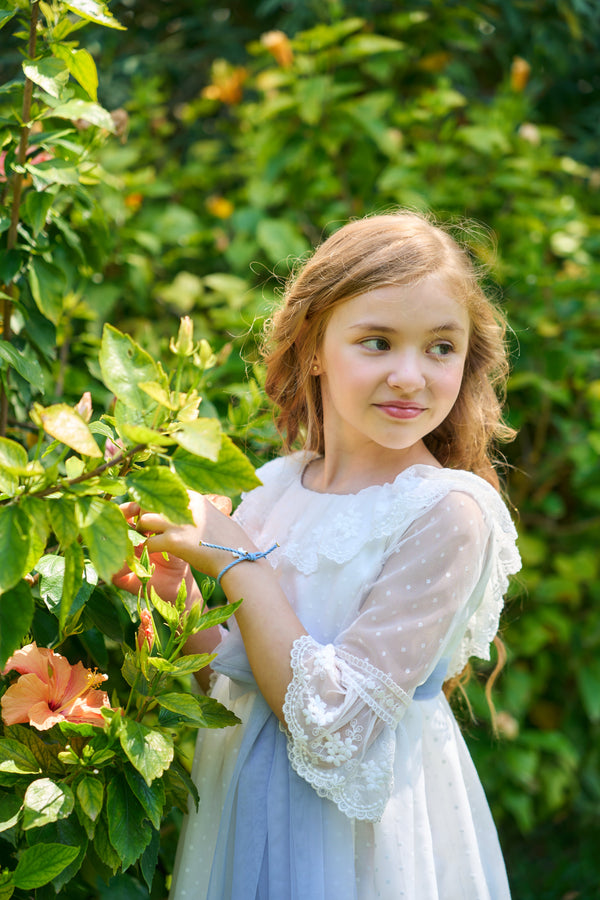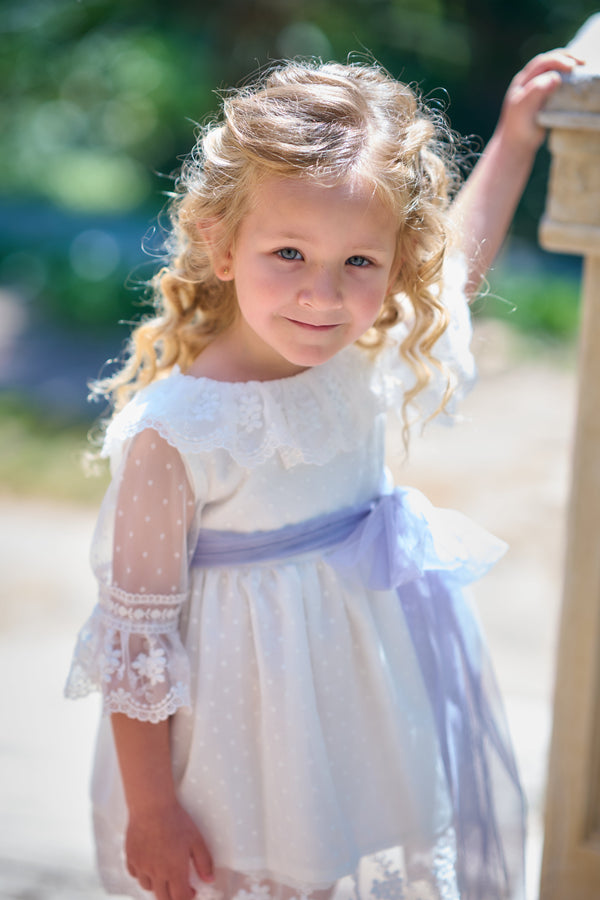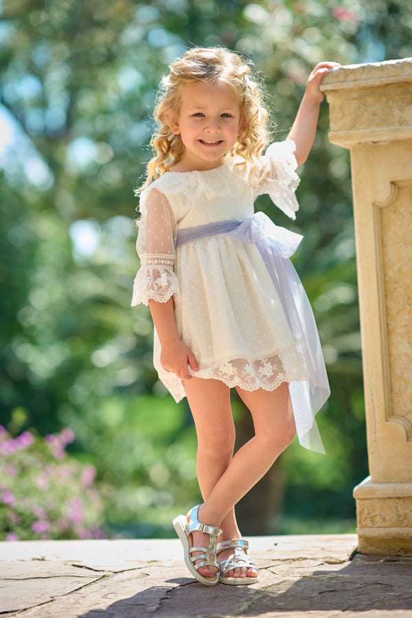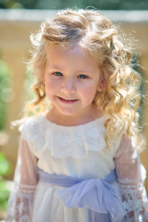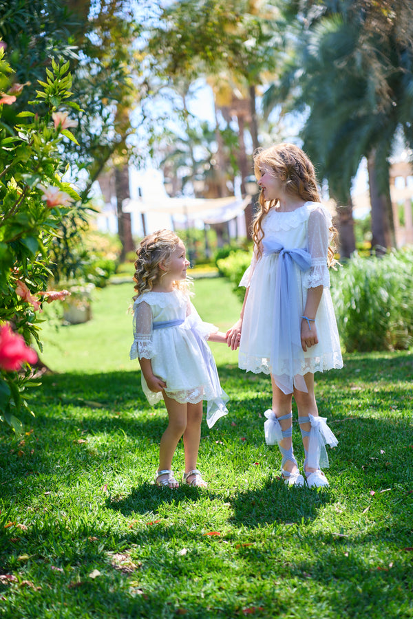 Vestido Etamin Lunar Tul Blanco con Lazo Celeste