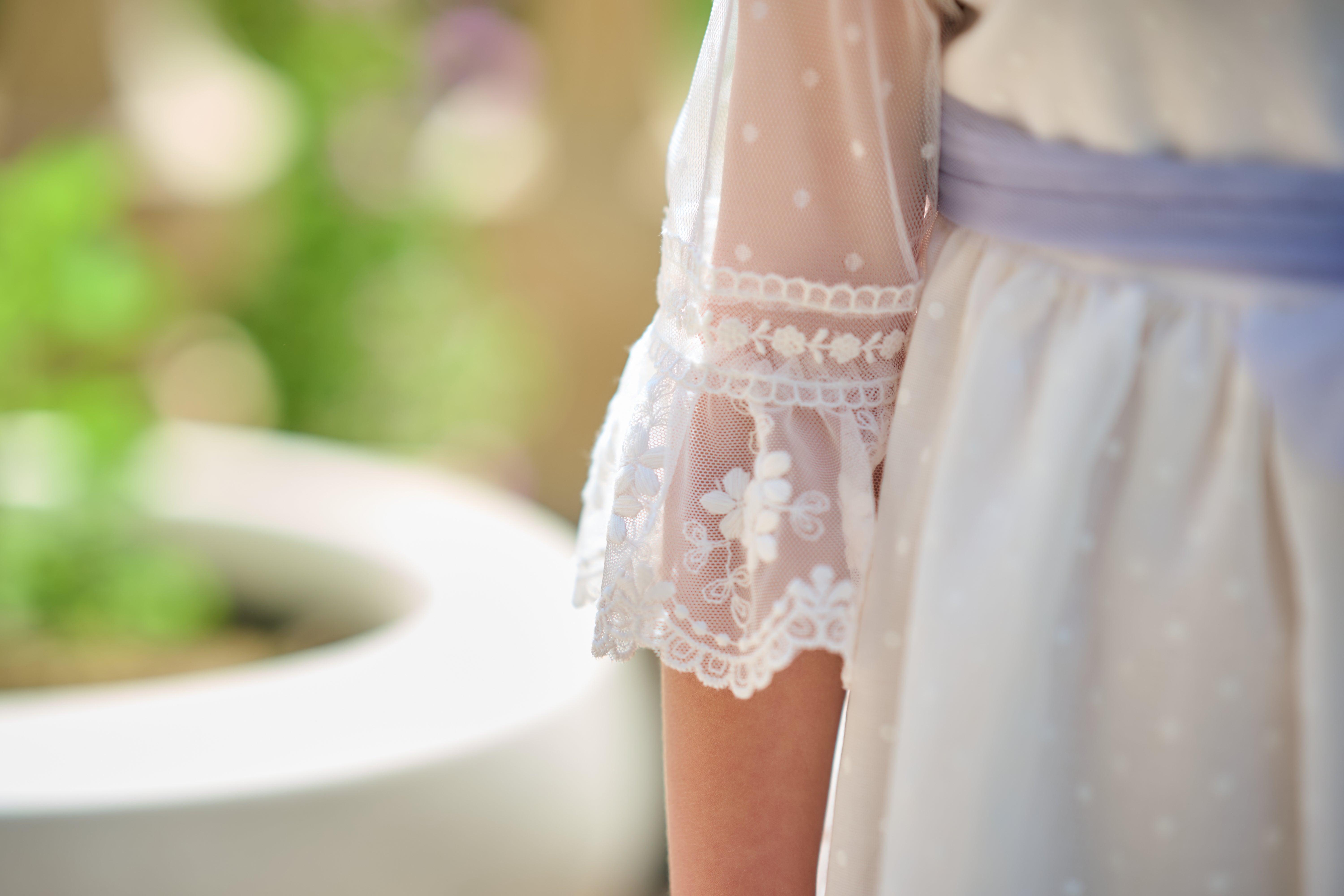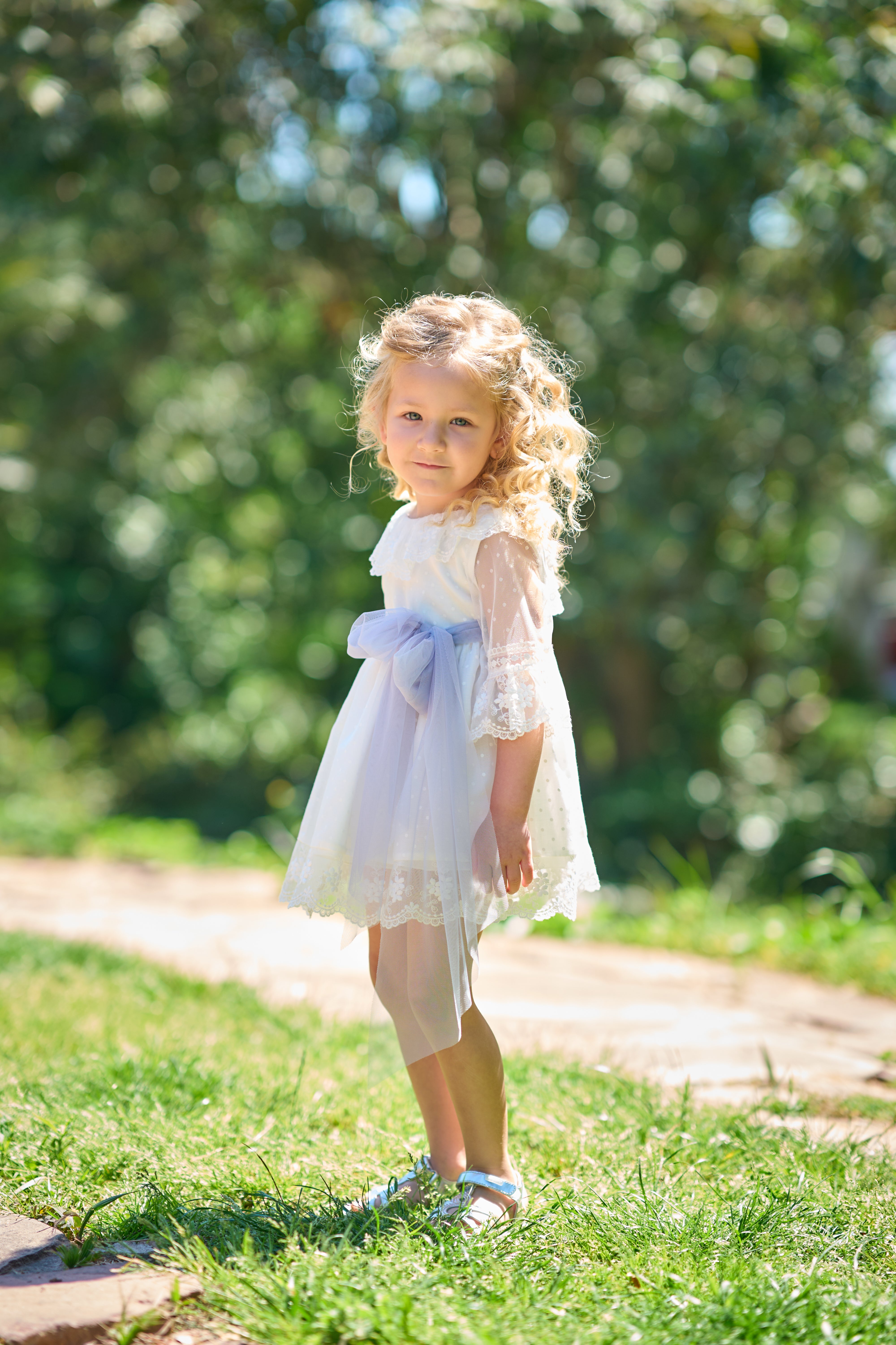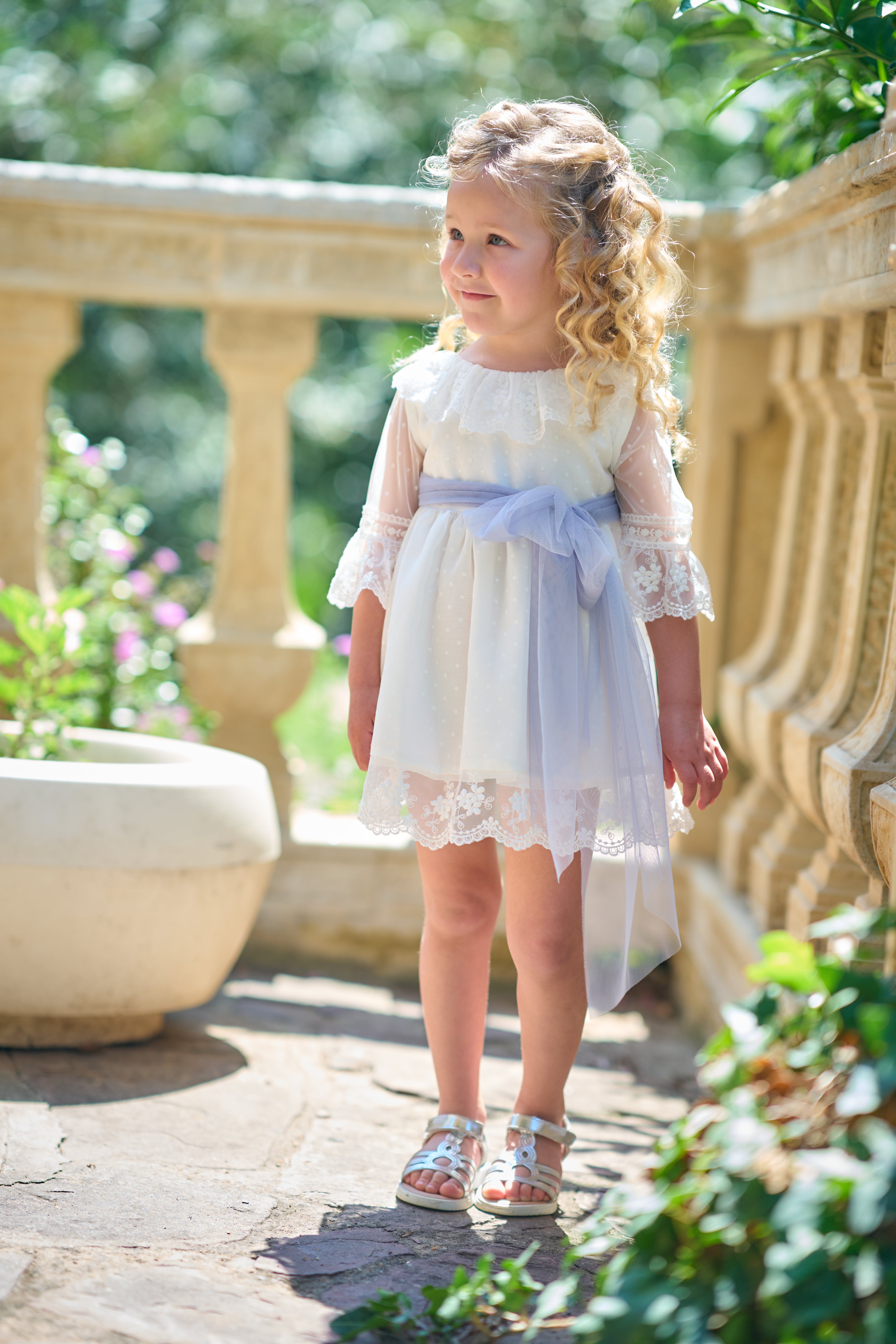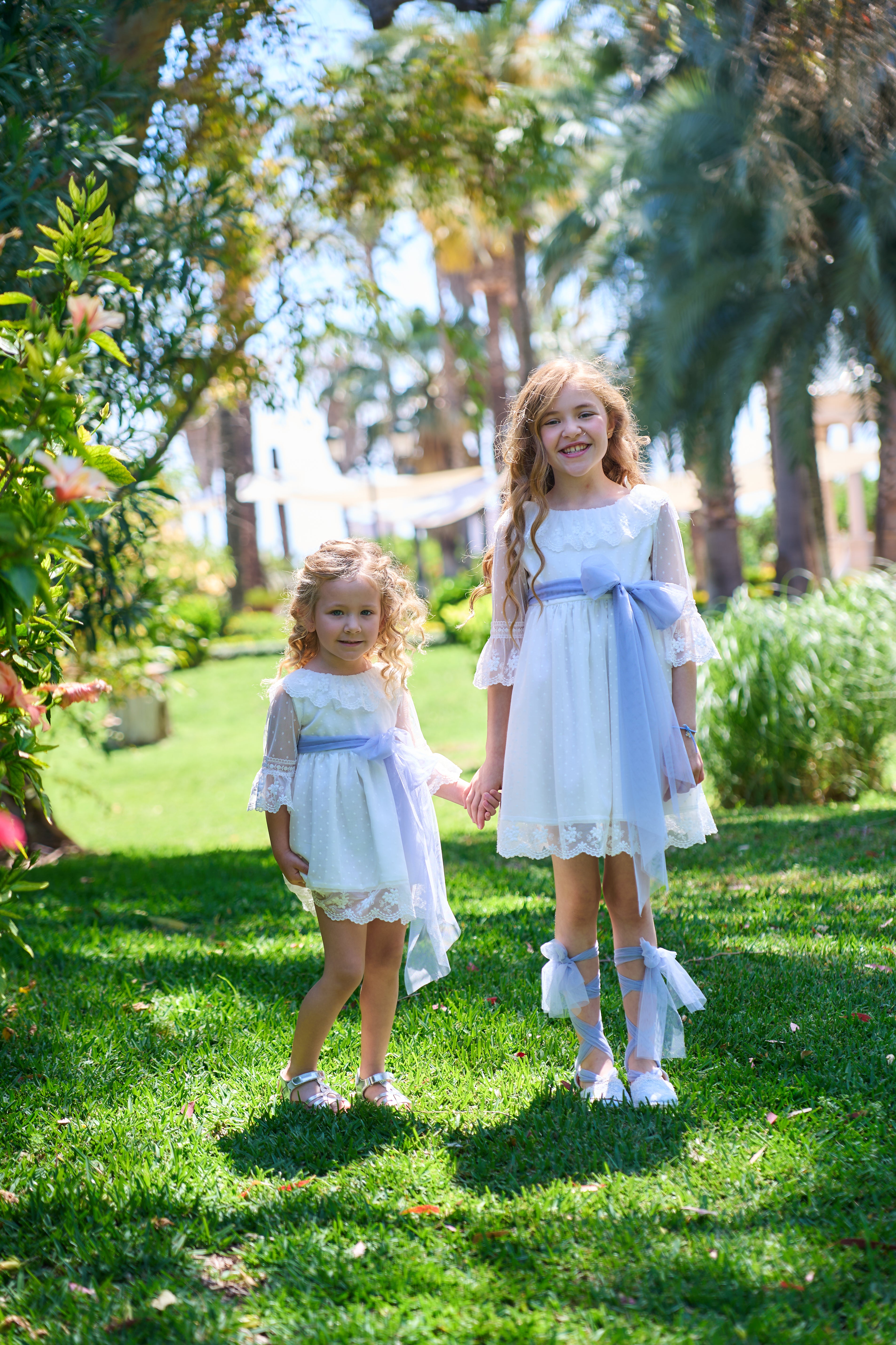 Vestido Etamin Lunar Tul Blanco con Lazo Celeste