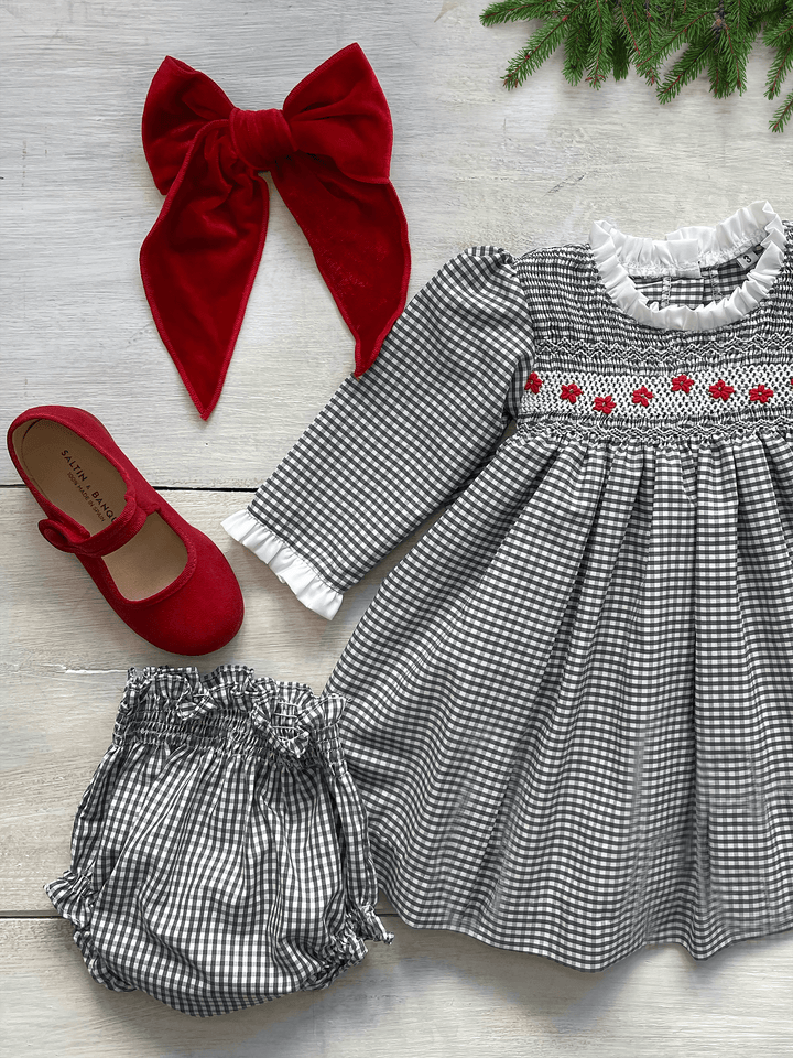 Vestido Punto Smock Cuadros Grises con Detalles Rojos