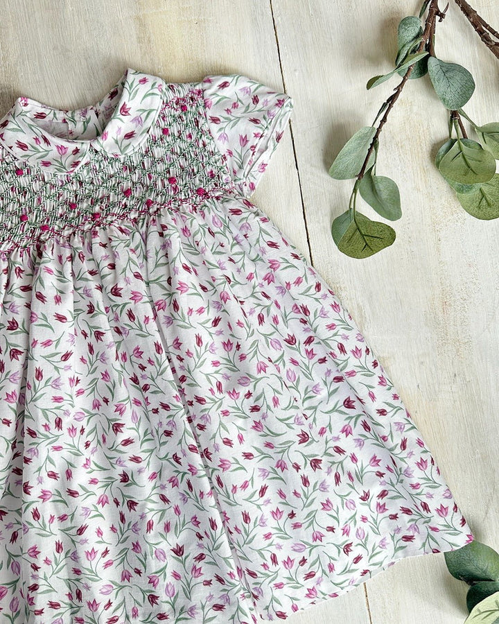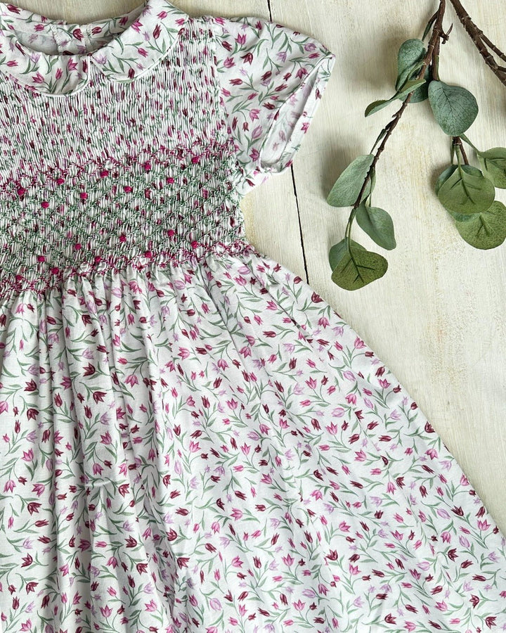 Vestido de algodón con bordado punto smock, detalle en cuello y mangas